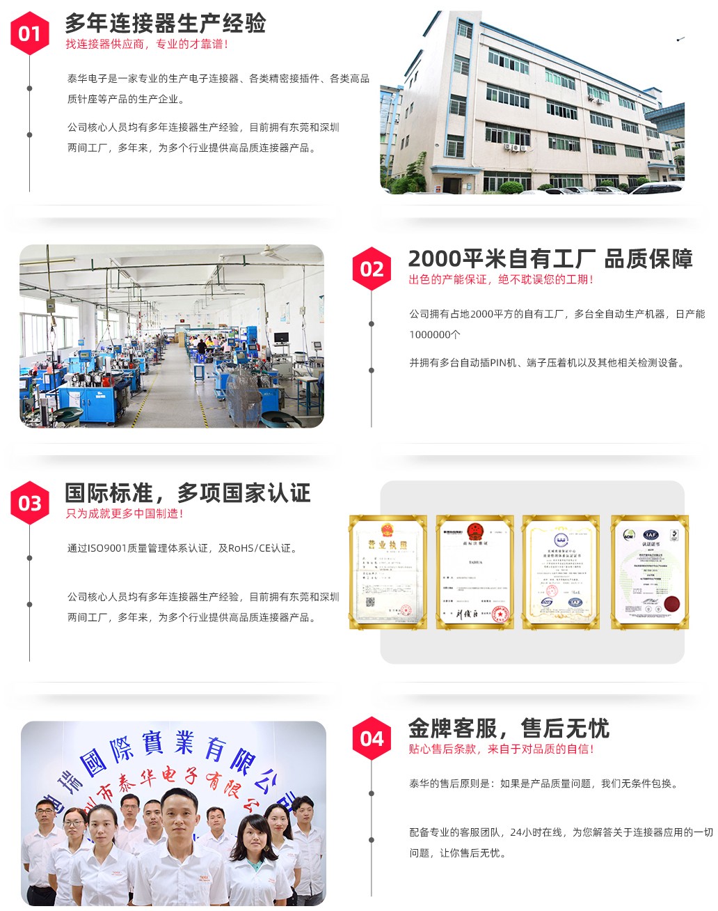 深圳市泰華電子有限公司15年專注連接器,多來成功為全國2000家大中小型企業(yè)提供專業(yè)的技術(shù)和服務(wù)。本公司具備先進(jìn)的生產(chǎn)設(shè)備,標(biāo)準(zhǔn)化生產(chǎn)流程接插件日產(chǎn)100萬。所有產(chǎn)品通過ISO9001、ROHS等認(rèn)證,自成立以來一直秉承品質(zhì)為先,客戶至上的理念。